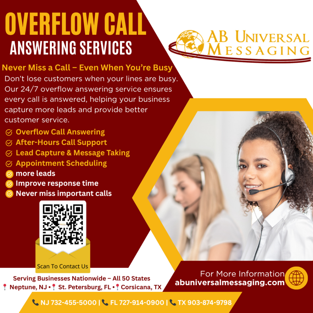 Don’t lose customers when your lines are busy. AB Universal Messaging’s 24/7 overflow answering service ensures every call is answered, helping your business capture more leads and provide better customer service.