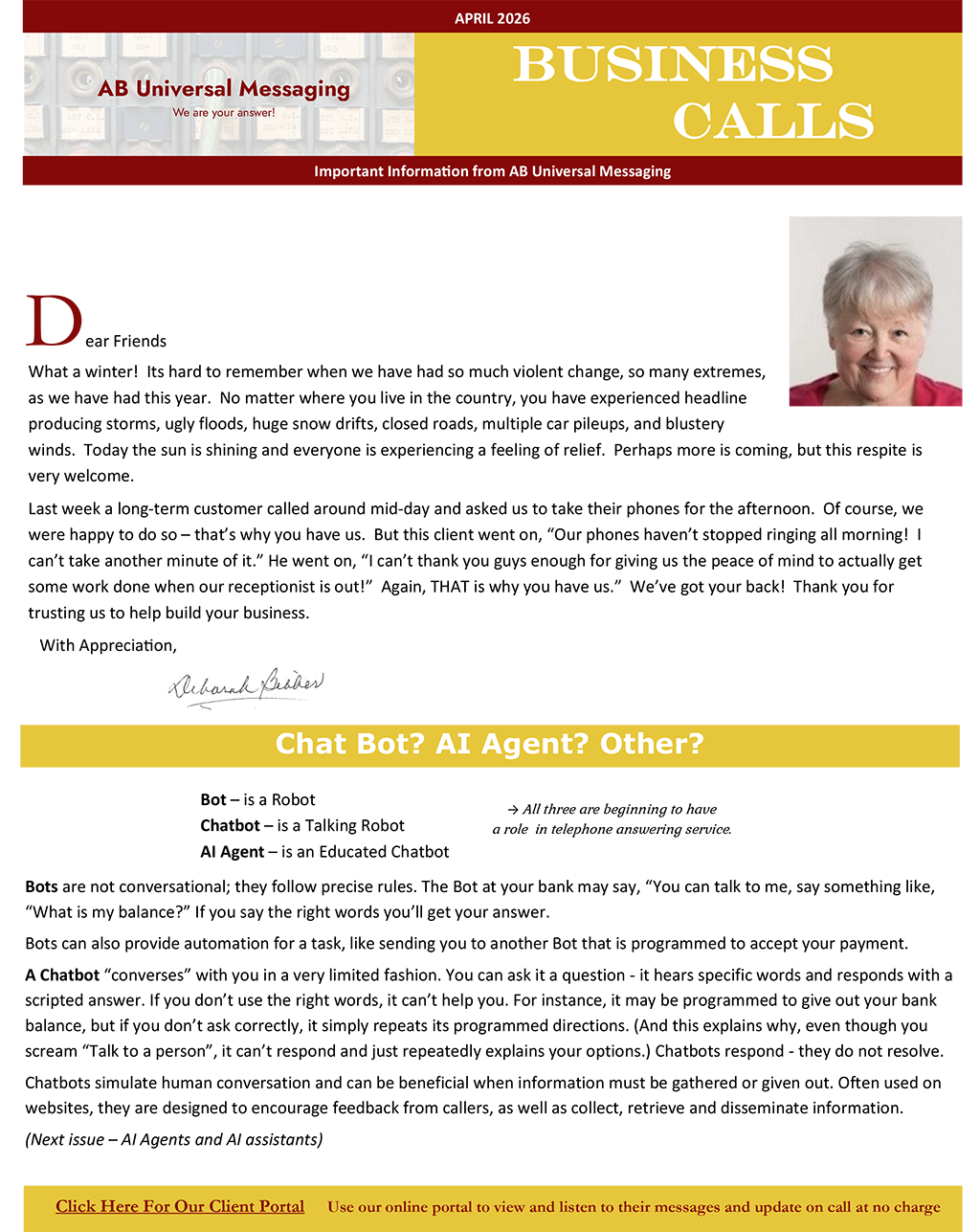 - AB Universal wants input on how clients use their answering service and where improvements are needed